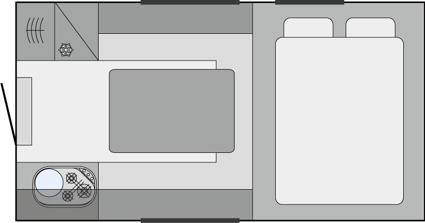 Typical of TISCHER is the surprisingly spacious interior, which has been thought through down to the last detail, with attractive decorative coating on the interior walls and hard-wearing PVC flooring. The fully integrated kitchen with ignition-safe 3-burner gas hob, “Nirosta” sink, absorption refrigerator and plenty of storage space in cleverly organized kitchen cupboards sets a strong accent. The kitchen units and table have hard-wearing surfaces. In the middle seating area, high-quality foam cushions with a height of 8 cm ensure comfort. The group can be converted into a lying surface in a few simple steps and then offers a bed size of 198 x 111 cm. The regular bed in the alcove of the cabin measures 198 x 155 cm.