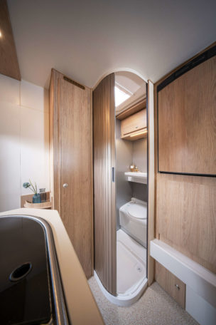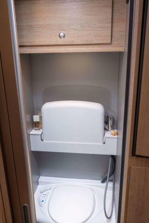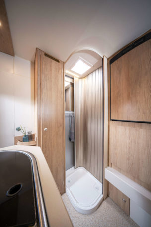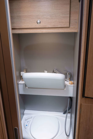 Während z. B. das Handwaschbecken bei Konkurrenzmodellen kaum über Spucknapf-Format hinausreicht, sorgt dieses Detail bei TISCHER wegen seiner Größe und Funktion regelmäßig für bewundernd hochgezogene Augenbrauen. Mit einem Griff lässt es sich komplett nach oben wegklappen und schafft damit den nötigen Freiraum, um in der Zelle zu duschen. Für die Aufbewahrung persönlicher Hygieneartikel ist ausreichend viel Platz im nahtlos integrierten Hängeschrank vorhanden. Darüber hinaus gehört bei TISCHER die moderne Banktoilette von Marktführer Thetford mit erhöhtem Sitz und berädertem Fäkalientank ebenso zum Bad-Ensemble wie eine absolut leichtgängige und leise Schiebetür. Sie besteht aus hochwertigem Kunststoff, ist wasserresistent und schließt das Bad ohne zusätzlichen Raumbedarf harmonisch vom übrigen Kabineninterieur ab.