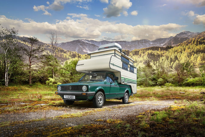 Iconic vehicle in use for decades: An originally converted and excellently preserved TISCHER Caddy at the TISCHER stand at “selbstausbau” in Stuttgart demonstrates the high manufacturing quality and shows how sustainable TISCHER’s product philosophy is.