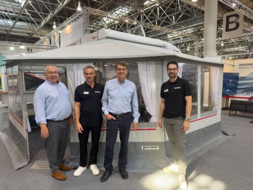 Das neue TISCHER Außenzelt entstand in enger Zusammenarbeit der Unternehmen dwt-Zelte und TISCHER Freizeitfahrzeuge GmbH. Hier im Bild: (v.l.n.r.): Claus Winneknecht (Geschäftsführer dwt), Thomas Hoffmann (Vertriebsleiter TISCHER), Steffen Schwerdtner (Entwicklungsleiter dwt) und Patrick Sauer (Geschäftsführer TISCHER).