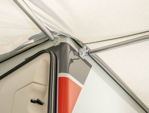 Für sichere und dichte Verankerung am Fahrzeug wird die Kante des Zeltdachs an zwei Kabinenseiten über die vormontierte Kederschiene eingezogen. Die solide Befestigung der qualitätsvollen Alu-Zeltstangen erfolgt über bequem fixierbare Vario-Clips Typ S. Hier muss nichts geschraubt werden. Die Befestigungspunkte lassen sich frei bestimmen.