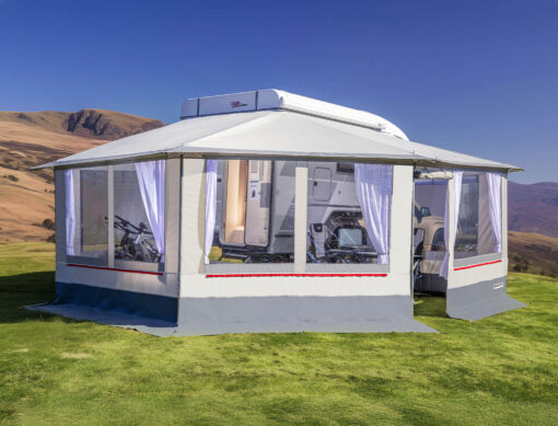 Die Dimensionen des hochwertigen Textilanbaus an TISCHER Kabinen können sich sehen lassen: Seine Anbauhöhe liegt zwischen 252 und 270 cm. Der Einzug erfolgt über die an der Kabine montierte Kederschiene. Das Zelt ist 6-teilig und besteht neben dem Dach aus zwei Seitenwänden und drei Vorderwandteilen mit einer Breite von jeweils ca. 250 cm. Sie ermöglichen die geräumige Übereck-Aufstellung mit einer Zelttiefe von ca. 220 cm. Die Vorderwandteile mit ihren großzügigen Fenstern und dem bequemen Zelteingang lassen sich beliebig gegeneinander tauschen und sind bei warmem Wetter komplett entnehmbar. So wird das Zelt zum Sonnendach. Lichtdurchlässige und luftige Gazeeinsätze in den Zeltfenstern sorgen für optimale Querbelüftung, um Kondenswasser und Feuchtigkeit im Zelt möglichst gering zu halten. Zu den weiteren Ausstattungsdetails zählen serienmäßig mitgelieferte Gardinen und vor allem das umlaufende, die Wände gegen Witterung schützende konkave Vordach mit 30-cm-Tiefe.