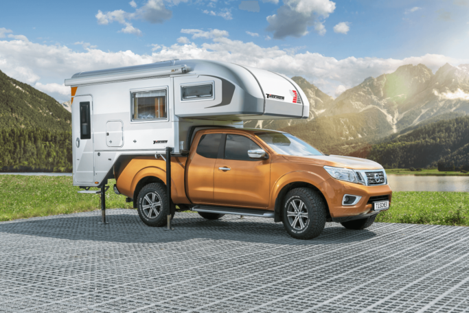 Das Aufsetzen der Kabine funktioniert ebenso einfach in umgekehrter Reihenfolge: Kabine so weit anheben, dass Sie den Pick-up darunterfahren können. Nun die Kabine wieder herablassen, die Halteteile befestigen, den 12 Volt-Stecker einstecken und die Stützen einfahren.