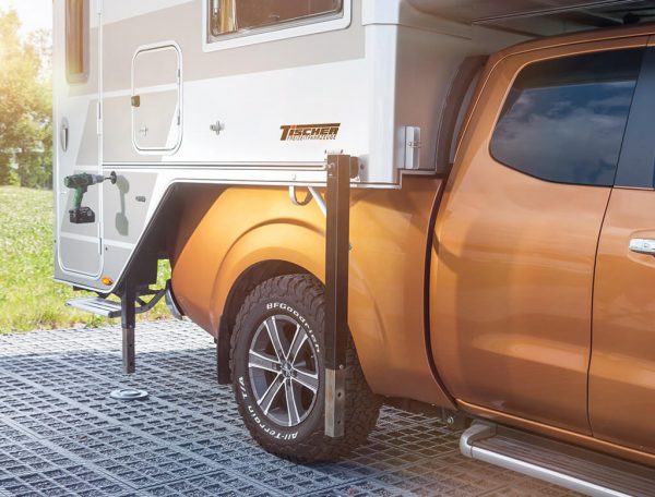 Zum Absetzen müssen Sie lediglich die Halteteile zwischen Kabine und Pick-up lösen und die vier Stützen bis zum Boden herunterlassen. Dabei werden die Stützen mithilfe einer Kurbel, eines Akkuschraubers oder elektrisch so weit ausgefahren, bis sich die Kabine vom Fahrzeug trennt. Nachdem Sie das Fahrzeug weggefahren haben, lassen Sie die Kabine für einen bequemen Einstieg wieder ein Stück nach unten ab.